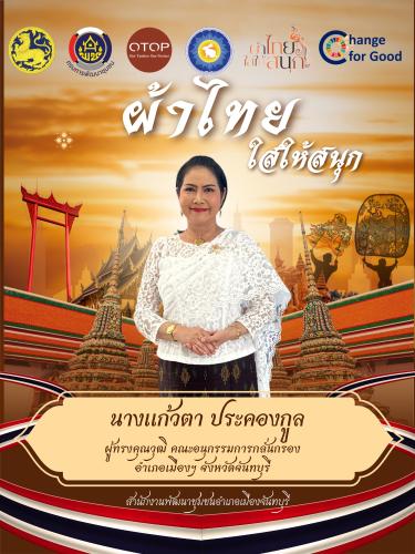 นางแก้วตา ประคองกูล ผู้ทรงคุณวุฒิคณะอนุกรรมการกลั่นกรองอำเภอเมืองจันทบุรี เชิญชวนสวมใส่ผ้าไทย ร่วมสืบสาน รักษา และต่อยอด พระราชปณิธานของสมเด็จพระนางเจ้าสิริกิติ์ พระบรมราชินีนาถ พระบรมราชชนนีพันปีหลวงในการอนุรักษ์ผ้าไทย และงานหัตถศิลป์ ทั้งนี้เป็นการน้อมนำตามพระดำริสมเด็จพระเจ้าลูกเธอ เจ้าฟ้าสิริวัณณวรี นารีรัตนราชกัญญา ในการสืบสาน อนุรักษ์ศิลป์ภูมิปัญญาท้องถิ่นของไทย และสนับสนุนกลุ่มอาชีพผลิตภัณฑ์แปรรูปผ้าไทยให้มีรายได้เพิ่มขึ้น